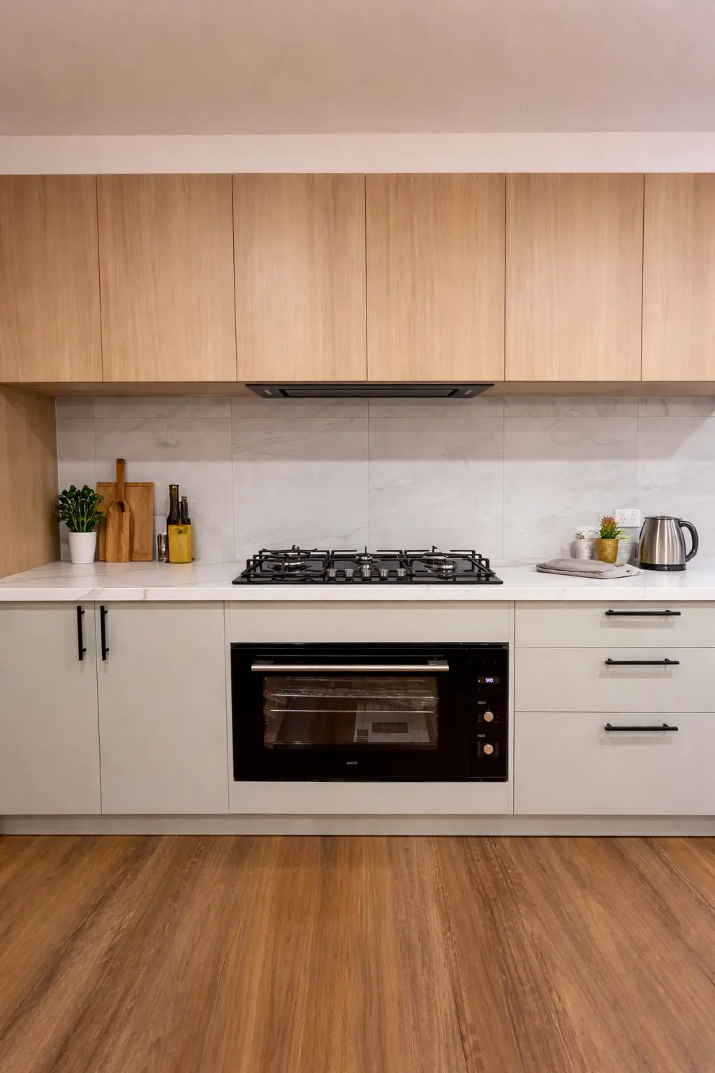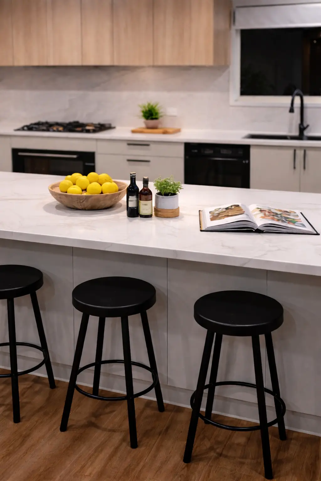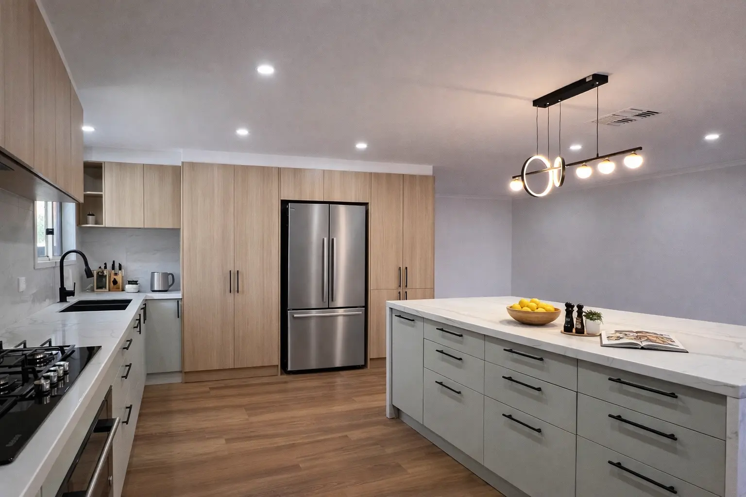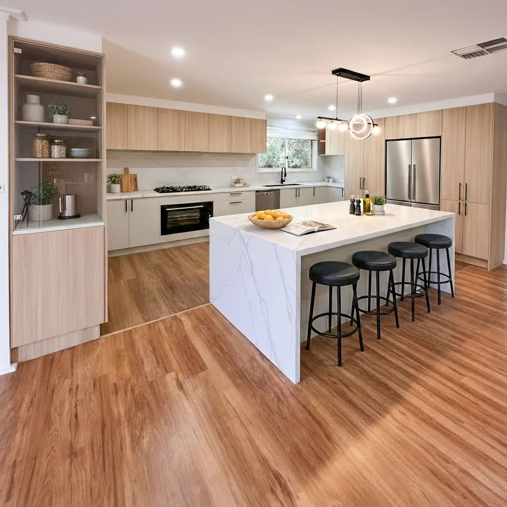 The completed kitchen is a refined, functional showpiece that seamlessly blends luxury finishes with intelligent design. The expansive island anchors the space, while integrated storage solutions ensure everything has a dedicated place. Warm timber textures, soft matte cabinetry, and premium stone surfaces create a sophisticated yet inviting atmosphere.