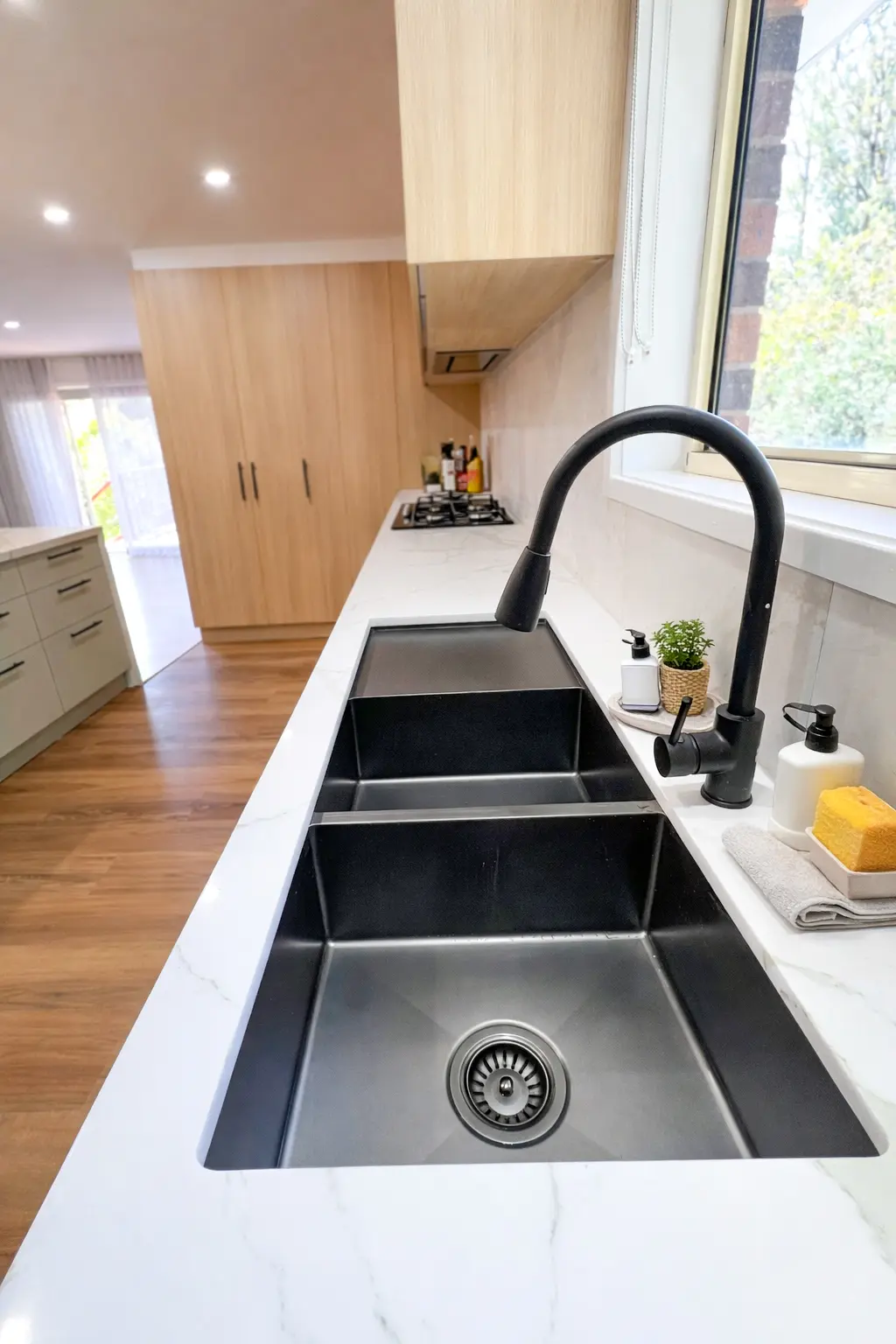 A statement 2400 × 1200 mm island became the focal point of the kitchen, designed for both functionality and sophistication. One side features push-to-open cabinets for a seamless look, while the opposite side incorporates soft-close pull-out wire basket drawers and an integrated pull-out bin system for efficient storage. The island is finished with a 40 mm Calacatta Gold Vein stone benchtop and waterfall panels on both sides, adding visual weight and a luxurious finish.