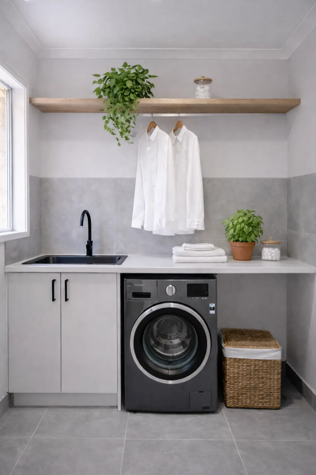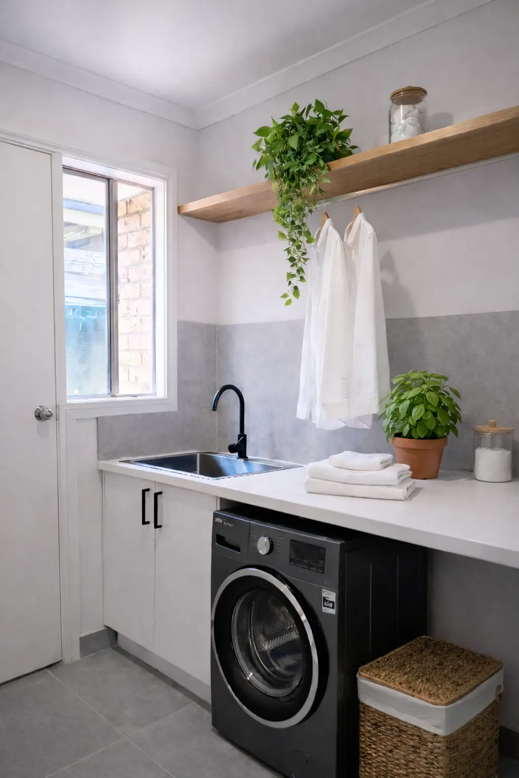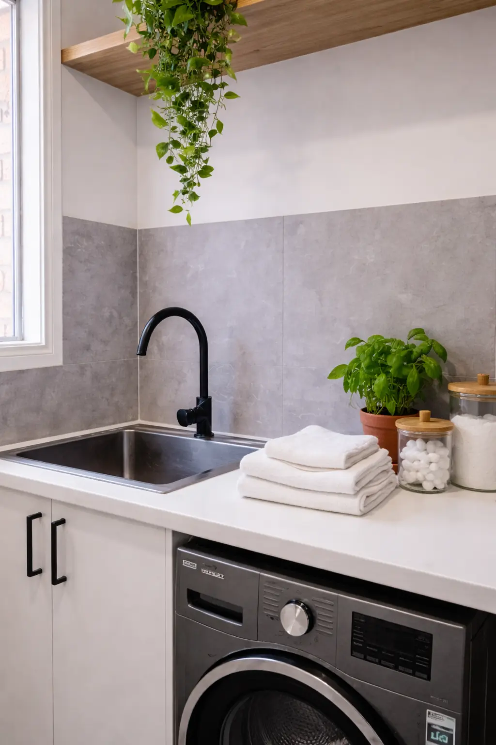 The finished laundry now delivers both style and performance. Concealed plumbing, integrated joinery, and coordinated finishes create a polished modern environment that feels larger, brighter, and more organised. The space is now: